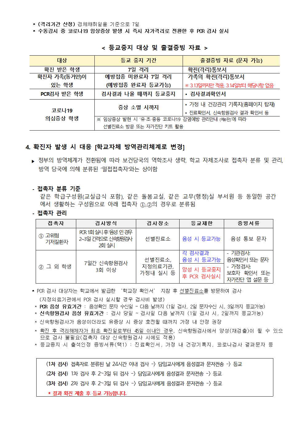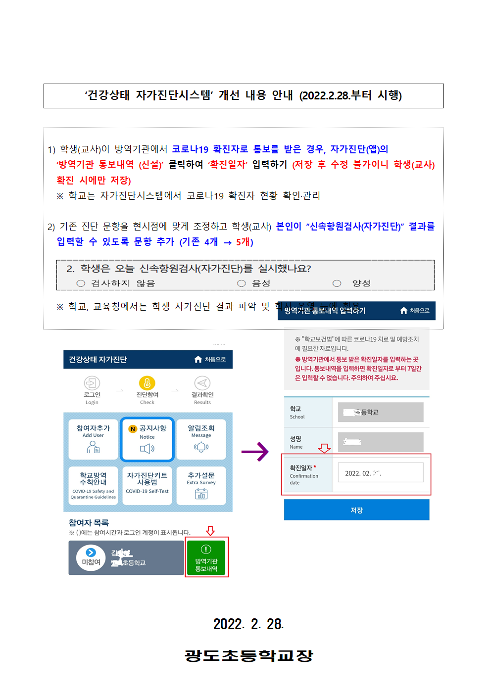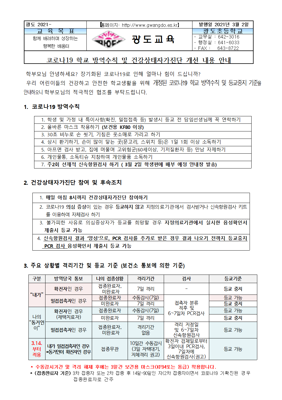 개정된 코로나19 학교방역수칙 및 등교기준 안내(건강상태자가진단개정내용 포함) *가정내 건강관리기록지