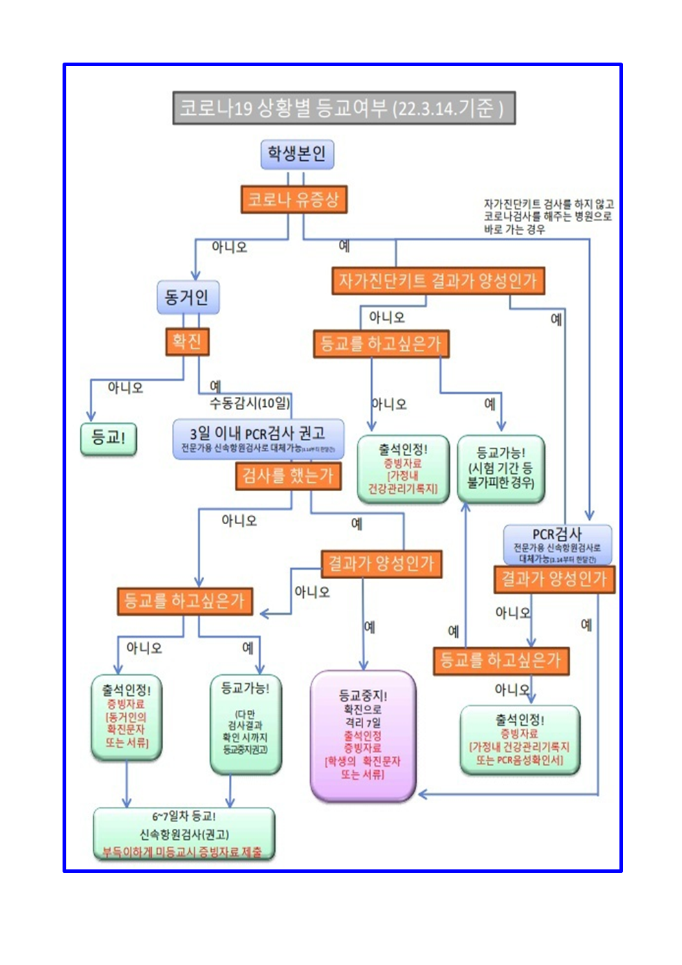 코로나19 상황별 등교기준 안내(22. 3.14.기준)