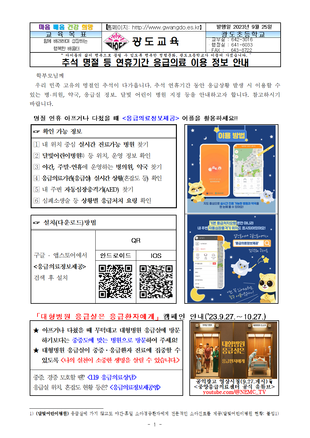 추석 명절 등 연휴 기간 응급 의료 정보 이용 안내