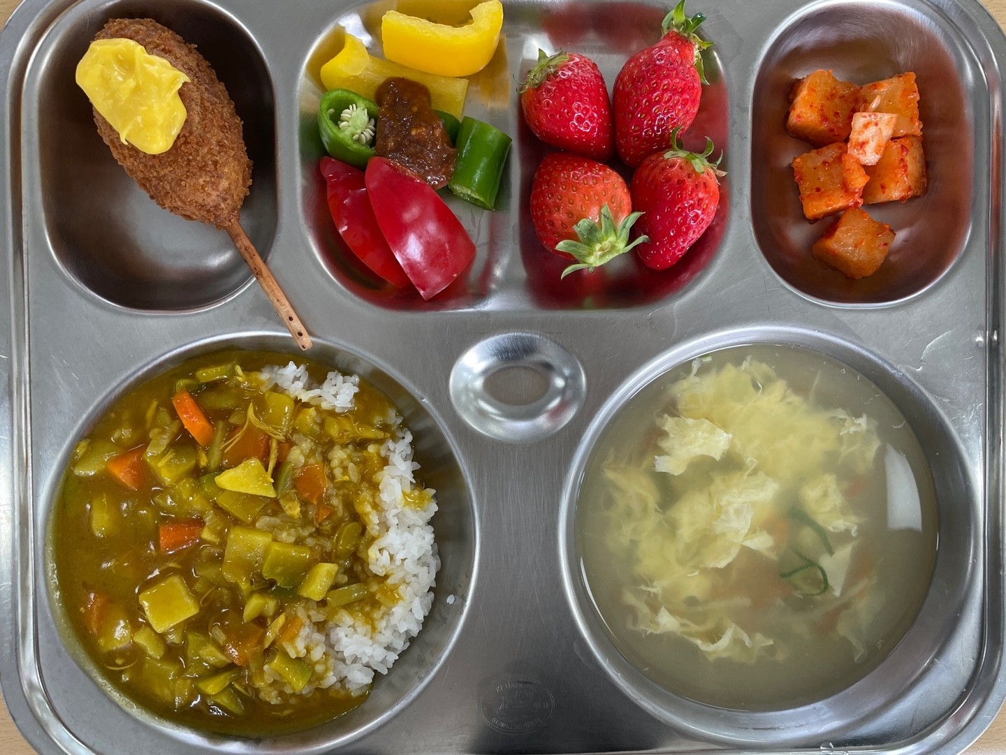 닭카레라이스(2.5.6.15)달걀국(1.5.6.18)깍두기(9)딸기옥수수핫도그(1.2.5.6.10.16)우유(2)모닝고추+파프리카(자)(5.6.13)* 에너지/단백질/칼슘/철646.7/23.5/328.1/2.3