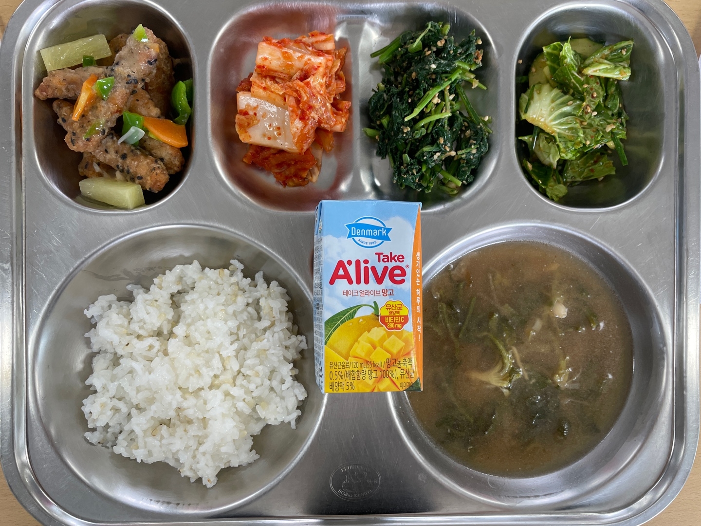 강황밥친환경현미밥냉이조갯살된장국(5.6.9.18)흑임자탕수육(1.5.6.10.12.)오이달래생채(5.6.13)배추김치(9)망고주스(13), 우유(2)취나물무침(자)(5.6.)698.5/20.6/359.2/9.2