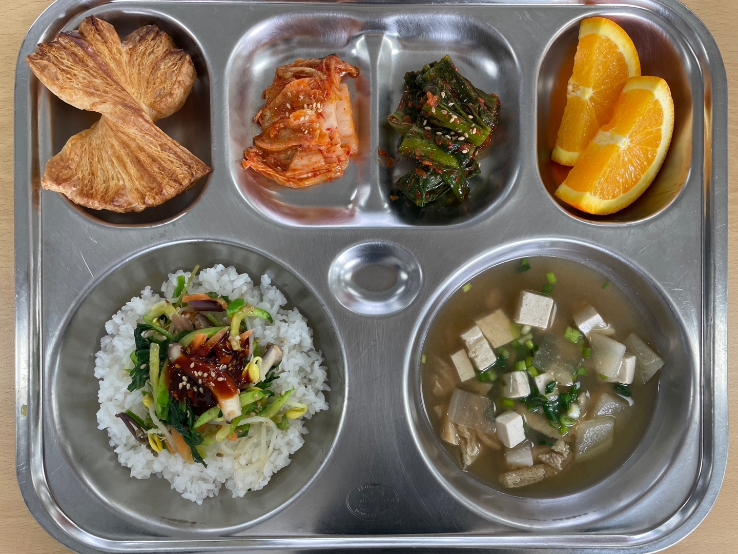봄나물비빔밥(채)(5.6.13.16)유부된장국(5.6.9)배추김치(9)갓김치(자)(9)오렌지플라워파이(1.2.5.6)우유(2)* 에너지/단백질/칼슘/철599.6/18.4/337.5/3.3
