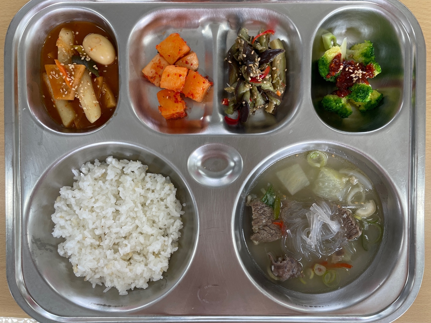 친환경현미밥한우갈비탕(5.6.16.18)가지나물볶음(자)(5.6)국물떡볶이(1.5.6.13)브로콜리초회(5.6.13)깍두기(9)우유(2)* 에너지/단백질/칼슘/철653.1/24.6/270.9/3.7