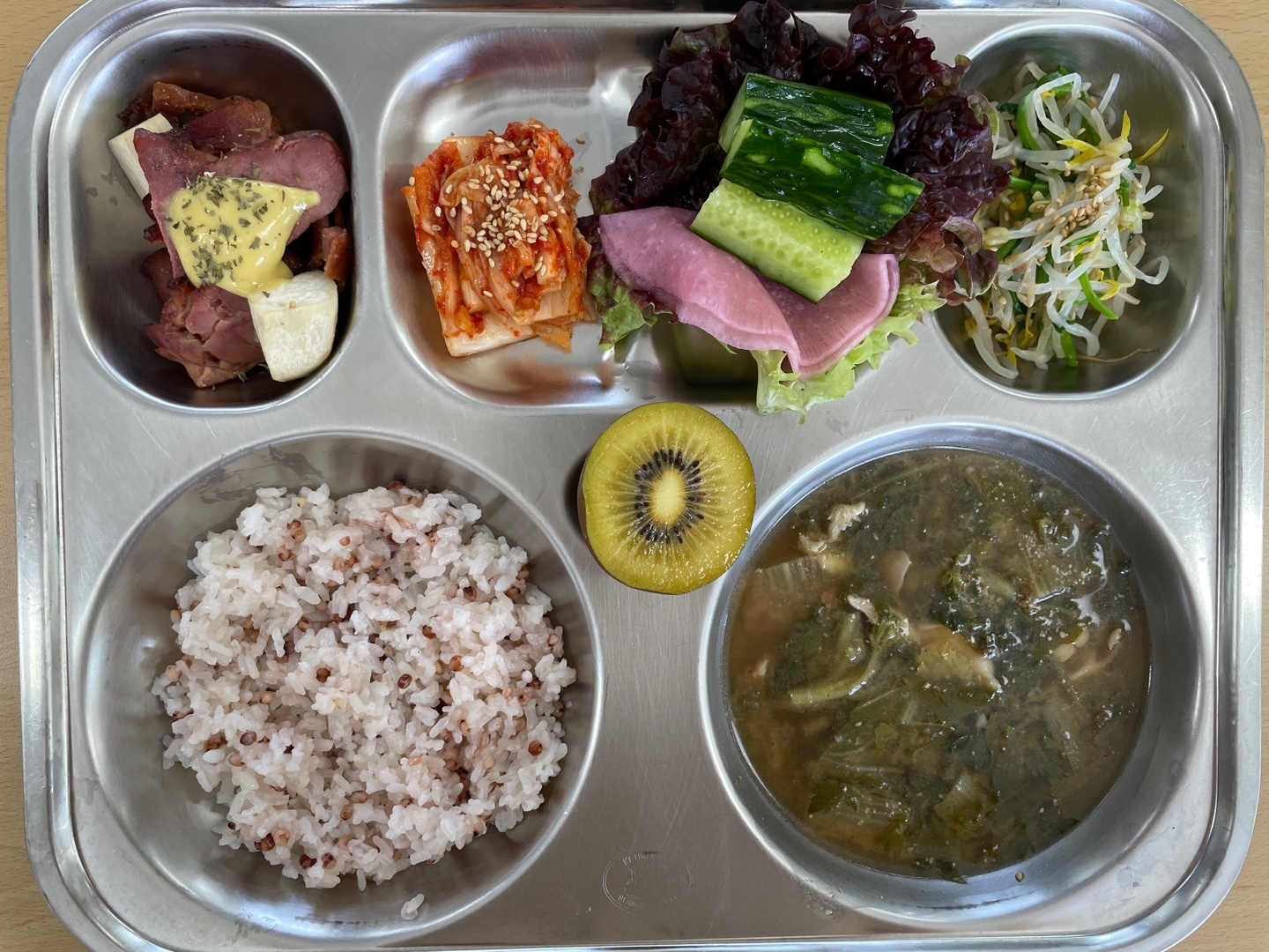 친환경차수수밥대합살쑥국(5.6.18)오리훈제+무쌈(1.2.5.6)숙주미나리나물(5.6.18)배추김치(9)골드키위상추쌈+오이스틱(자)(5.6.13)우유(2)* 에너지/단백질/칼슘/철660.4/22.6/260.0/3.3