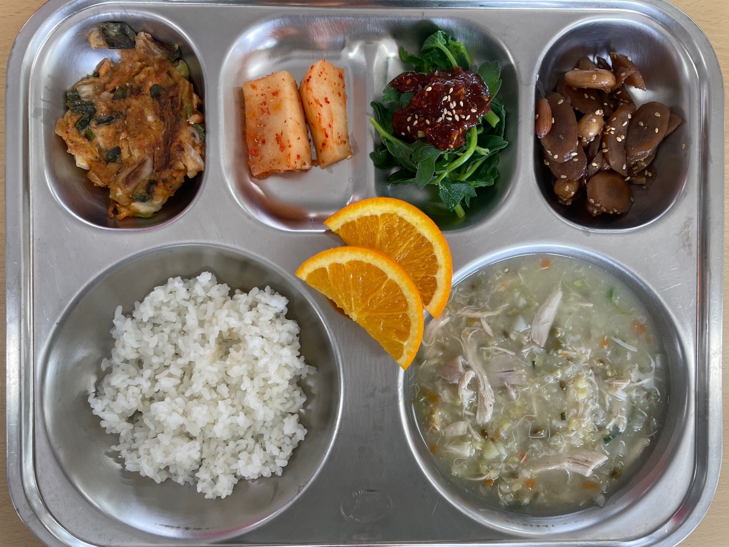 친환경찹쌀밥녹두삼계탕(15)우엉땅콩조림(4.5.6.13)해물김치전(1.6.9.17.18)알타리김치(9)방풍나물+초장(자)(5.6.13)오렌지우유(2)* 에너지/단백질/칼슘/철731.4/28.4/283.8/2.9