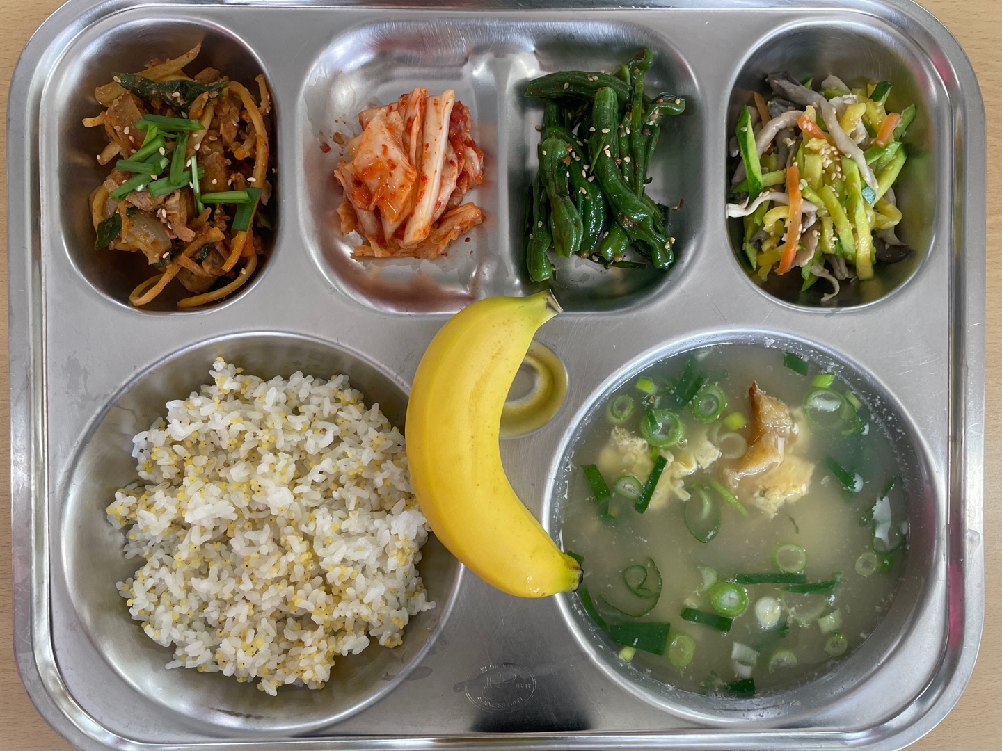 친환경기장밥꽈리고추찜(자)(5.6)애느타리호박볶음(9)오리불고기(5.6.13)황태누룽지탕(1.9)배추김치(9)바나나우유(2)* 에너지/단백질/칼슘/철615.8/34.0/328.1/4.5