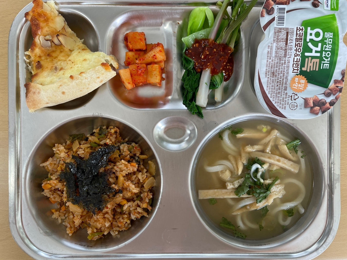 참치김치볶음밥(5.6.9.13.18)유부우동국(1.5.6.7.18)두릅,청경채+초장(자)(5.6.13)깍두기(9)고르곤졸라피자(1.2.5.6.10.12.13.15.16)토핑요거트(2)우유(2)* 에너지/단백질/칼슘/철710.3/25.3/489.8/2.0