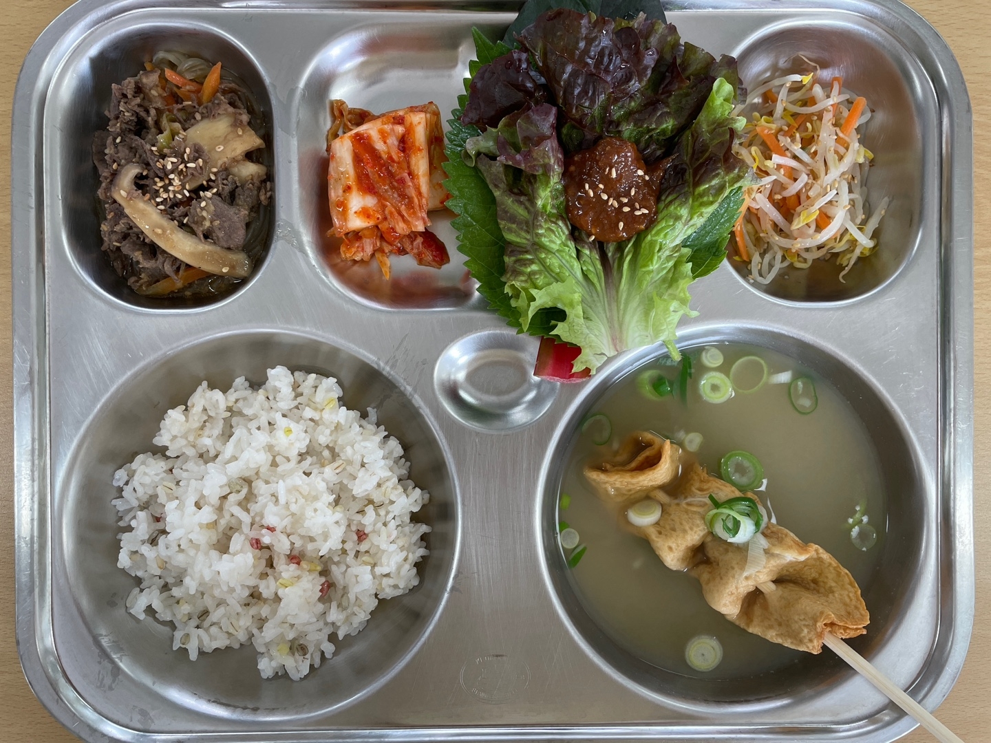 칠색보리밥꼬지어묵국(1.5.6.7.18)한우불고기(5.6.13.16)숙주당근나물1(5.6)배추김치(9)모둠쌈(자)(5.6)우유(2)* 에너지/단백질/칼슘/철572.3/30.5/281.7/3.5