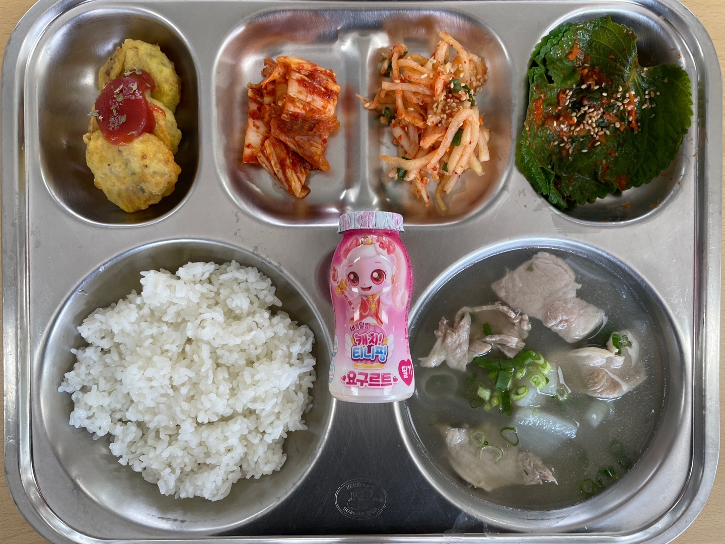 친환경칼슘밥맑은돼지곰탕&당면(10.16)도톰동그랑땡(1.2.5.6.10.12.15.16)생깻잎무침(5.6)무생채잔파무침(자율)(5.6)배추김치.(9)우유(2)캐릭터요구르트(2)* 에너지/단백질/칼슘/철639.4/22.7/261.7/3.0